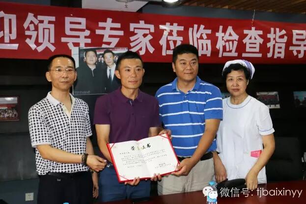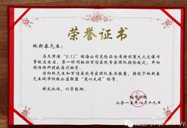 2015年8月20日,天津日报社领导亲赴百信医院,为奔赴滨海新区瑞海公司危险品仓库爆炸的灾区参与救援活动的百信医院医护团队,表达了崇高的敬意及诚挚的感谢,同时授予天津百信医院董事长林新太先生城市快报公益联盟“爱心大使”称号,并赠送了荣誉证书。